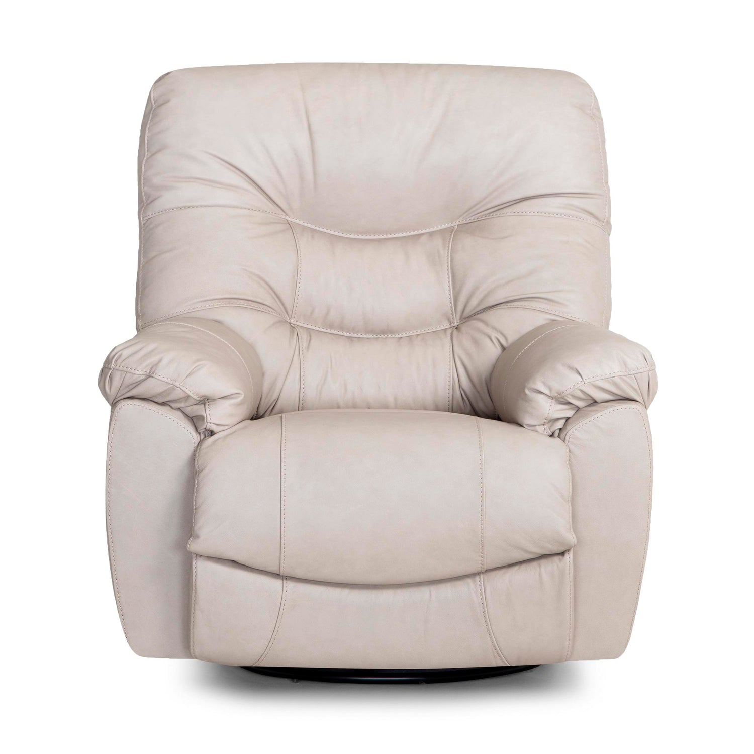 Take some time to relax in the Yogi Swivel Leather Rocker Recliner. Enjoy the catchers mitt inspired supported softness. While the sides and back side are upholstered in an easy care faux leather, the back and seat are upholstered in genuine leather. This can easily be the best seat in the house with built-in lumbar support and chaise style leg rest. Built with premium springs, gel-injected foam, and a heavy duty reclining mechanism to ensure long life.