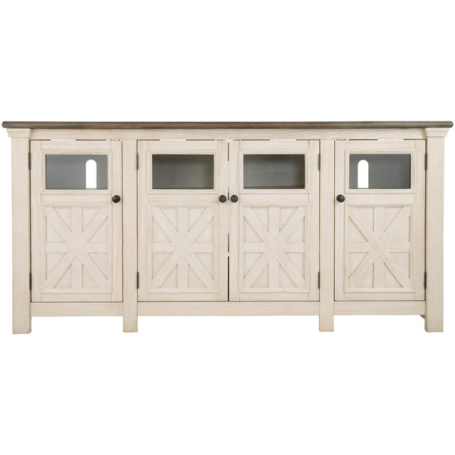 Adding a little farmhouse flair or shabby chic is easy with this extra-large TV stand. A two-tone finish with an antique white and a weathered oak color adds to the charm, and the cross buck adorned cabinets with glass inlays complete the look. Inside you'll find ample adjustable shelves to accommodate your storage needs and cutouts for wire management for your media needs.