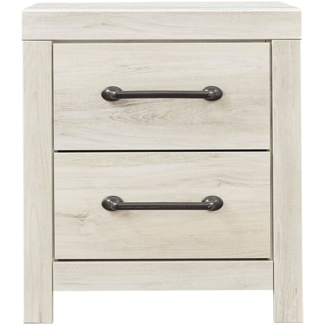 The Cambeck nightstand is all sleek, modern lines with a hint of farmhouse influence in the faux whitewash finish. Dark, oversized drawer pulls add the element of the unexpected to this transitional look. Side roller glides assure smooth drawer operation, and drawer interiors are laminated for a finished look. Made of engineered wood, this 2-drawer nightstand has a replicated wood grain finish perfectly complemented by the whitewash finish. Place it next to the panel bed for a beautifully coordinated look.