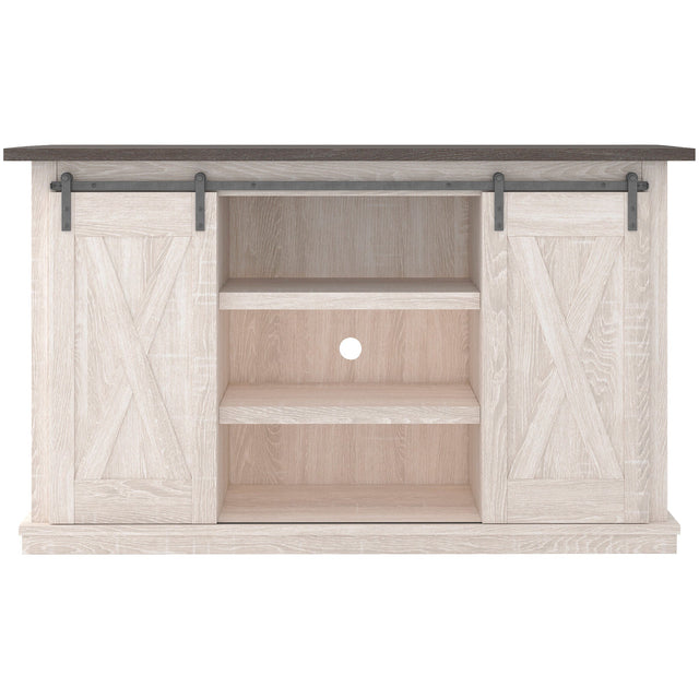 With its two-tone finish, cross-buck details and authentic charm, this TV stand is right in tune with your relaxed approach to high style. Beautifully made to accommodate your media equipment, it's well equipped with adjustable shelving, cutouts for wire management and, of course, a pair of sliding barn doors you can center or place to the side. What a mastery in modern farmhouse living.  - Product Details provided by Manufacturer, Slumberland not responsible for errors in information.