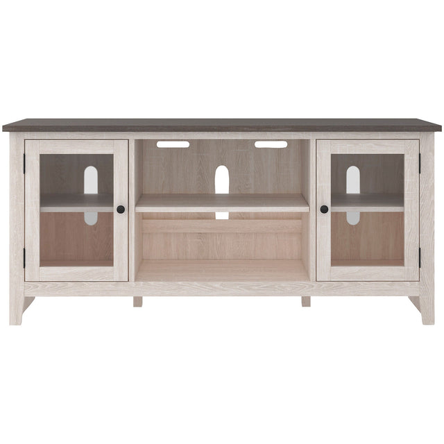 With its two-tone finish and minimalist charm, this TV stand with fireplace option is right in tune with your relaxed approach to high style. Beautifully made to accommodate your media equipment, it's well equipped with adjustable shelving, cutouts for wire management and a pair of glass-front doors that enhance the clean-lined aesthetic. The look is ideal for modern farmhouse and contemporary settings.  - Product Details provided by Manufacturer, Slumberland not responsible for errors in information.