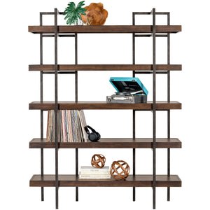 The Starmore walnut bookcase has a hint of mid-century influence, but its sleek lines and oiled walnut-tone finish give it modern, industrial overtones. This set of shelves is built around a tubular metal frame, nicely blackened to complement the oiled wood finish. Made of acacia veneers and engineered wood, this 5 shelf open bookcase won't dominate your wall space.