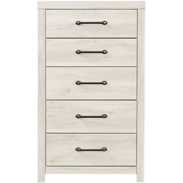 The Cambeck 5-drawer chest is all sleek, modern lines with a hint of farmhouse influence in the faux whitewash finish. Dark, oversized drawer pulls add the element of the unexpected to this transitional look. Side roller glides assure smooth drawer operation, and drawer interiors are laminated so there's no snagging. Made of engineered wood, this chest has a replicated wood grain finish perfectly complemented by the whitewash finish. Add the rest of the Cambeck bedroom pieces for a coordinated look.