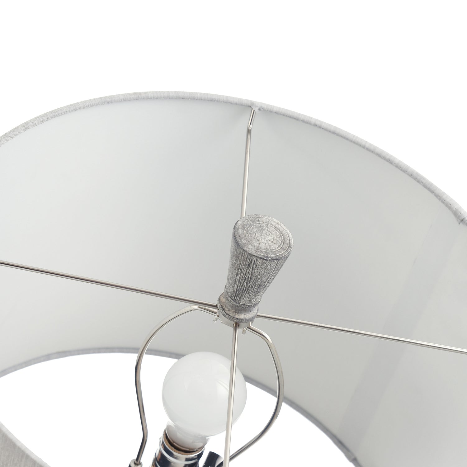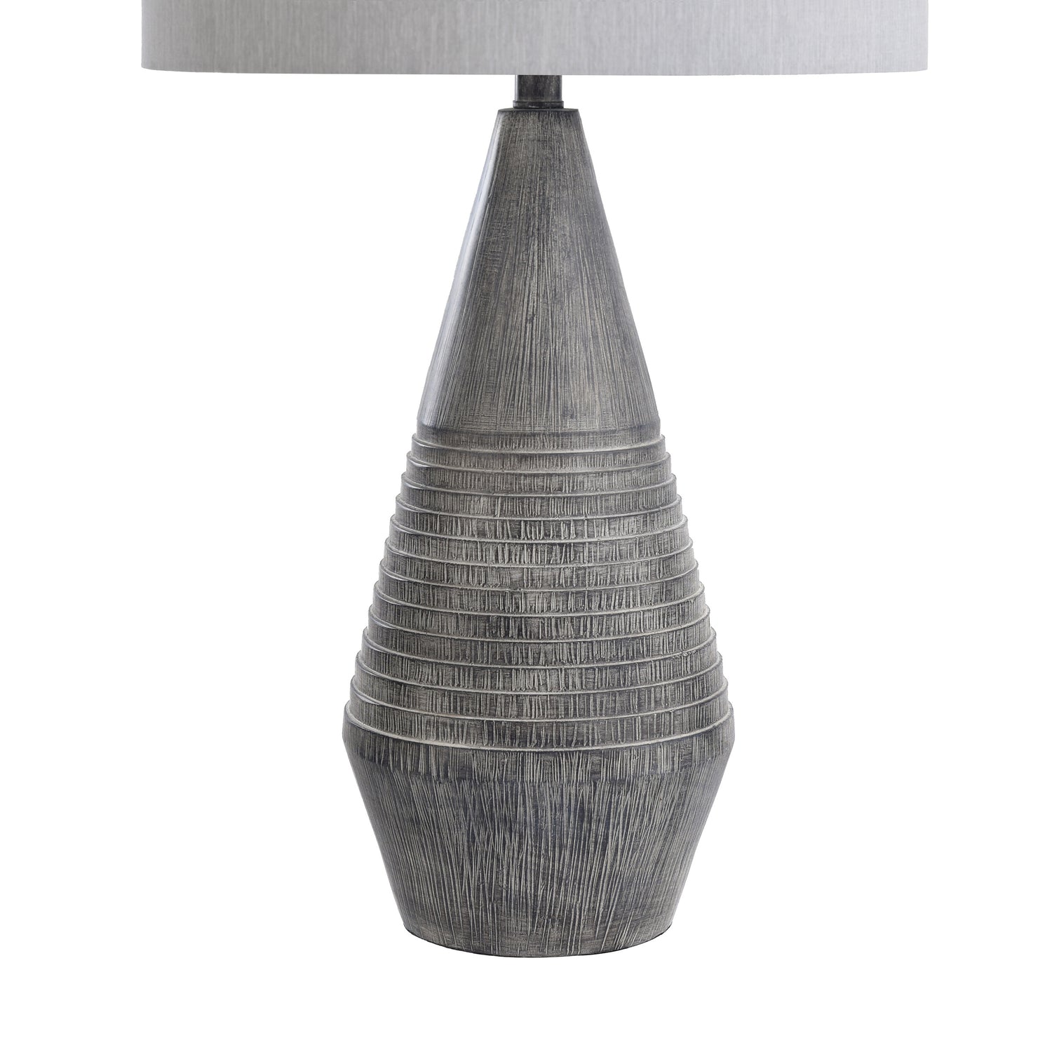 The Esme Table Lamp is more than just a welcoming source of light. The sculptural molded design and wood-like finish are sure to fit into any style of room and catch the eye. A fabric cylindrical lamp shade diffuses light in a way that is calm and serene, perfect for any room.