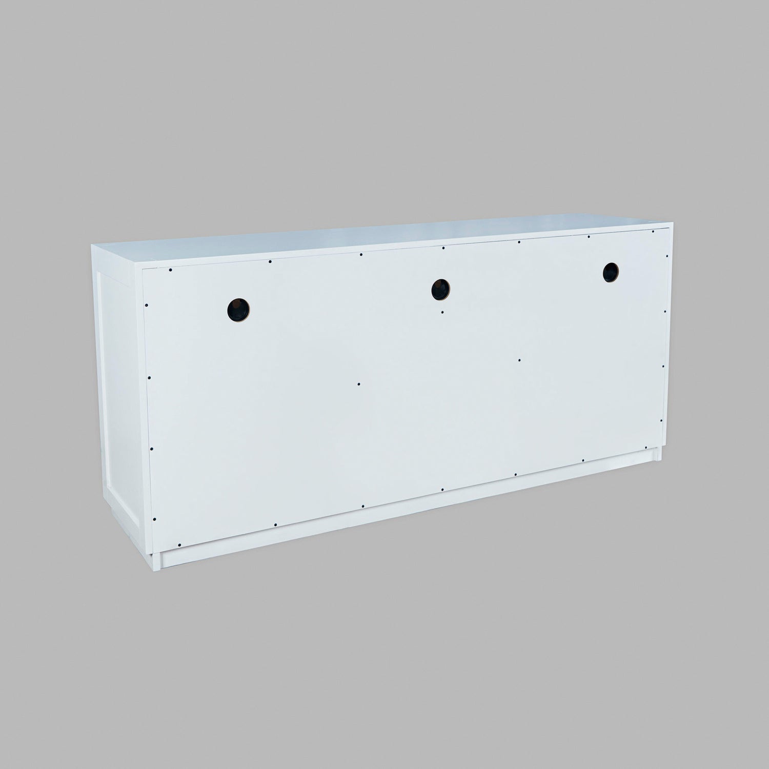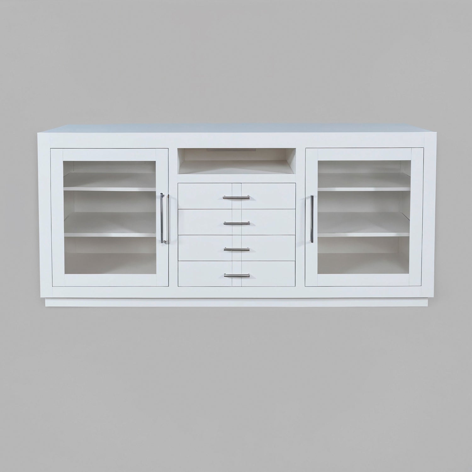 Contemporary design meets ample storage in the Auburn Hills 70 Inch Console. A bold frame and sleek bar hardware pair with tempered glass cabinet doors, perfect for storing items that you want tucked away, but still visible. Each cabinet has 2 adjustable shelves, so you can make sure it fits everything you need it to. And anything you want out of sight but still in reach can be put in one of the 4 center drawers. This modern TV stand is easy to assemble and at 70 inches wide, is just the right size for entertaining.