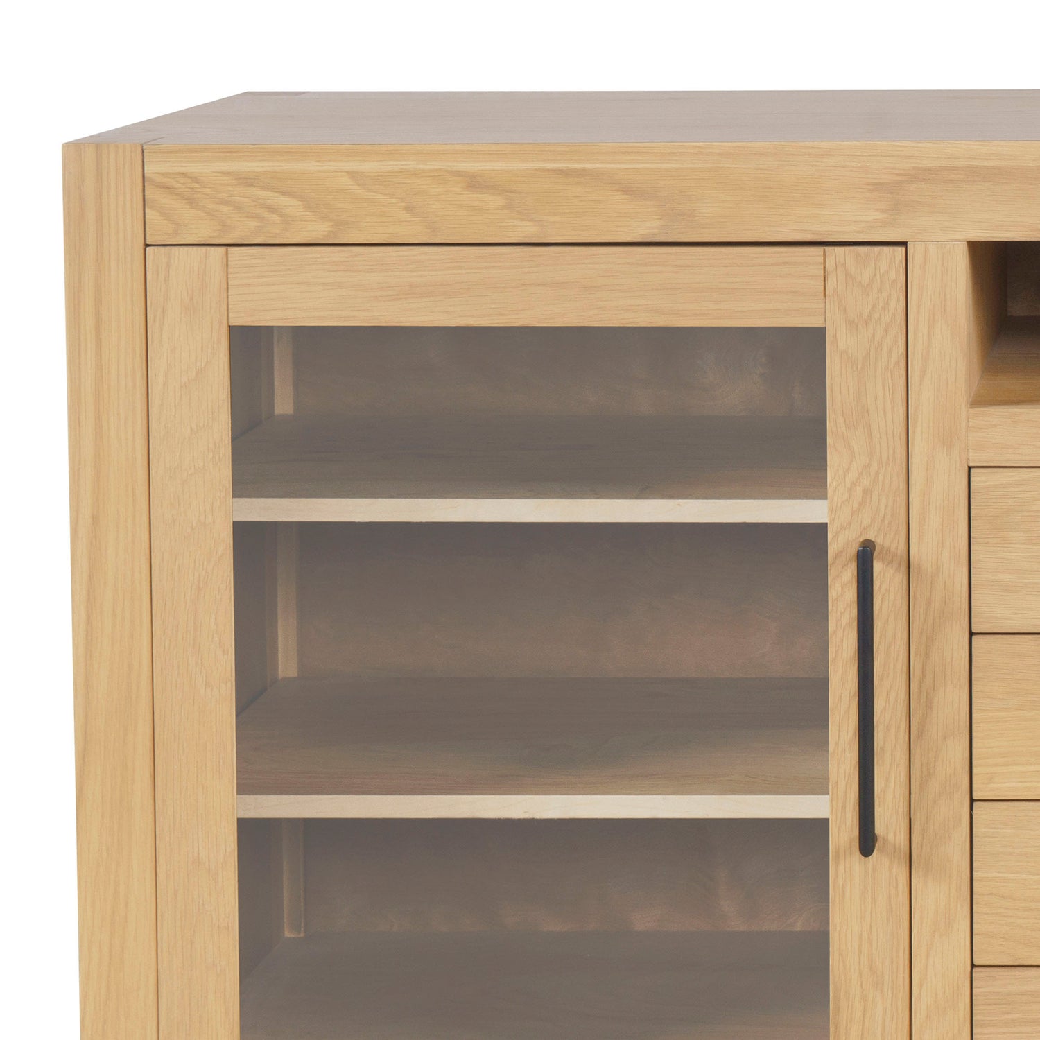 • Two tempered glass doors with matte black bar hardware