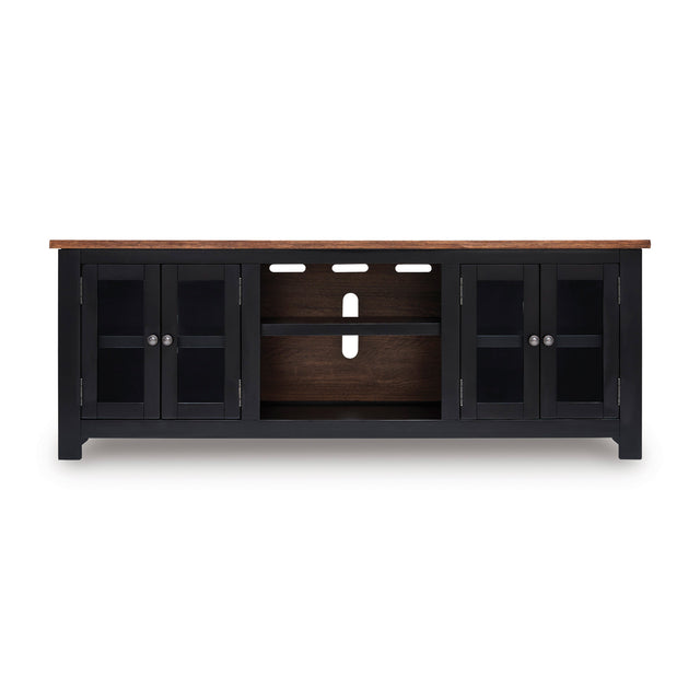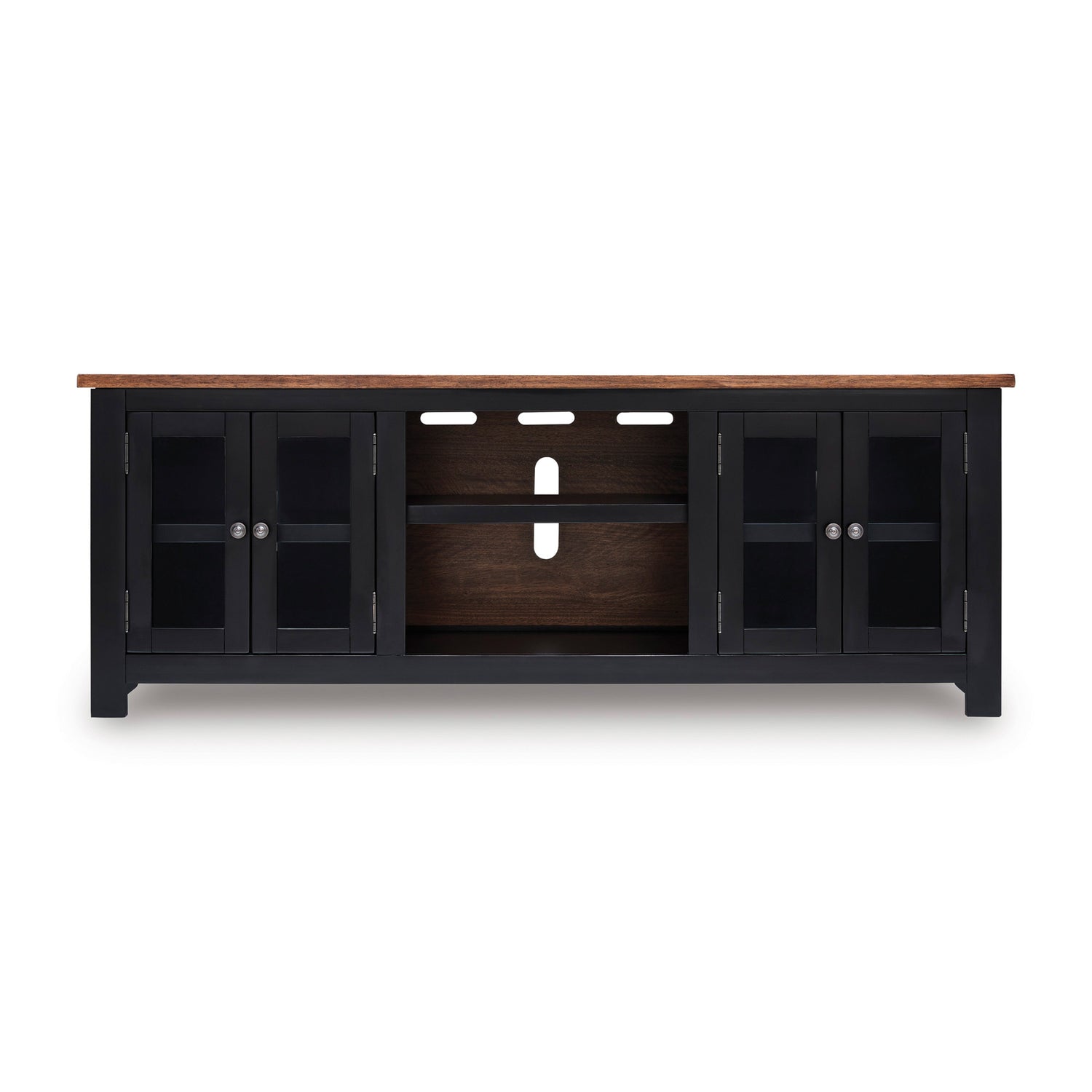 The Wildenauer 76 Inch Console is proof that storage can be stylish. The modern farmhouse style plays well with anything in a room. The contrasting butcher block veneer top is sophisticated while still retaining rustic charm. And this tv stand is functional too, with 2 glass door storage cabinets that are able to store electronics and anything you need tucked away, while the open center is perfect for displaying items that you need easy access to. Both the center area and the two cabinets have adjustable shelves.
