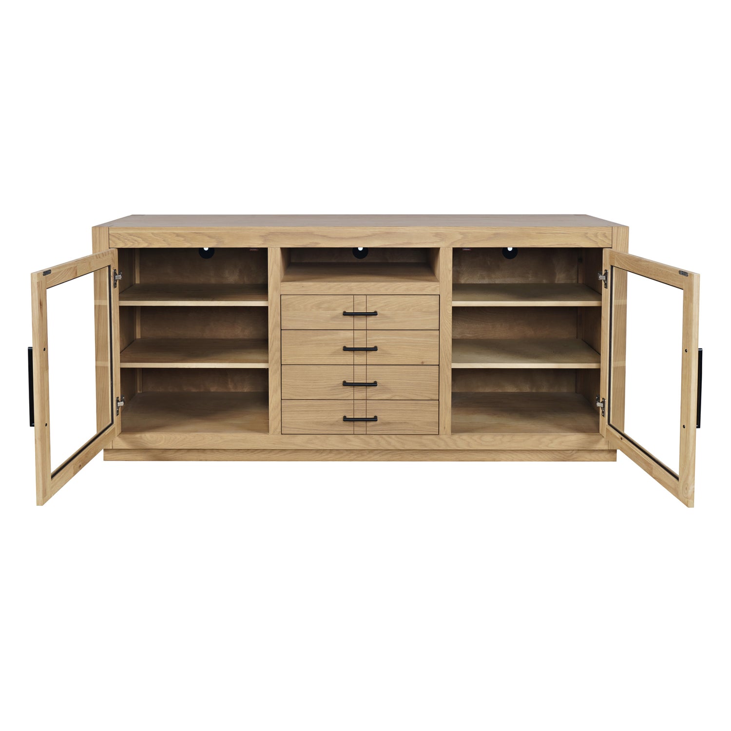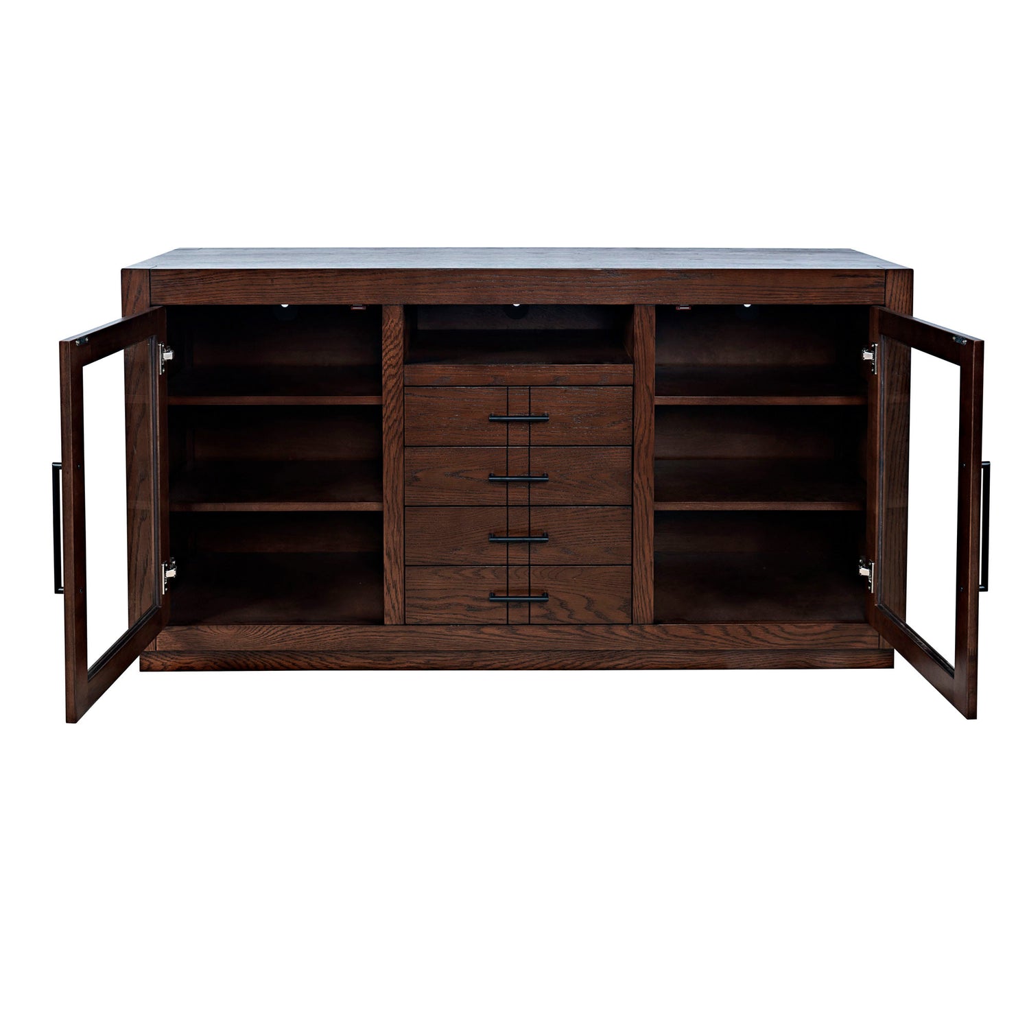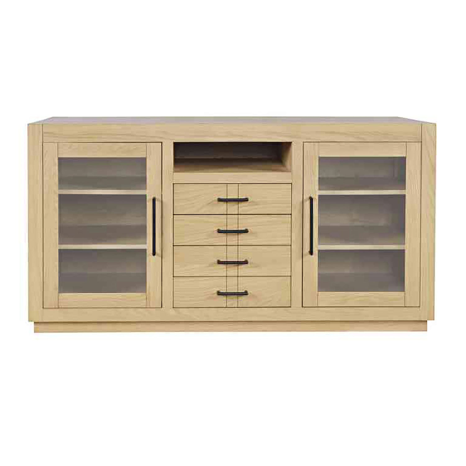 Contemporary design meets ample storage in the Auburn Hills 60 Inch Console. A bold frame and sleek bar hardware pair with tempered glass cabinet doors, perfect for storing items that you want tucked away, but still visible. Each cabinet has 2 adjustable shelves, so you can make sure it fits everything you need it to. And anything you want out of sight but still in reach can be put in one of the 4 center drawers. This modern TV stand is easy to assemble and at 60 inches wide, is great for any space.