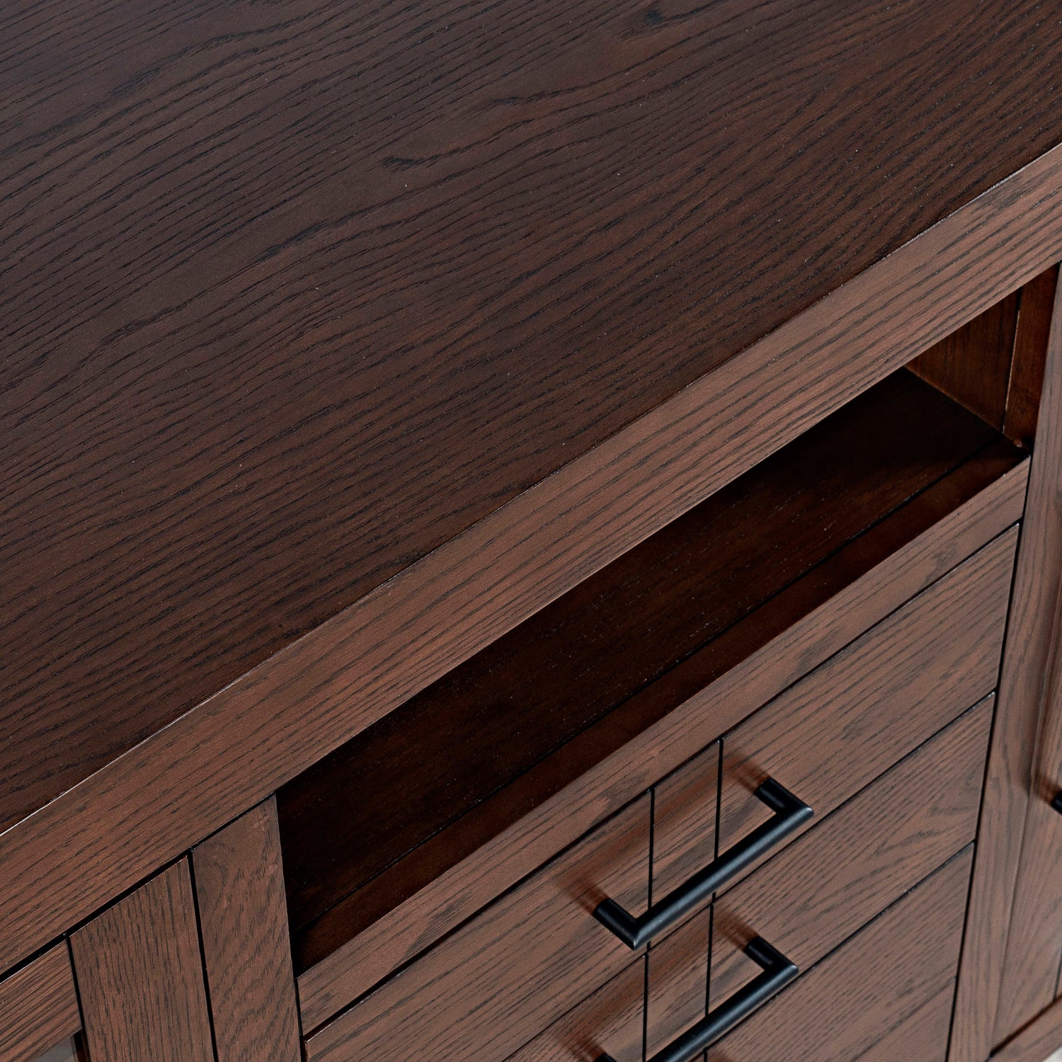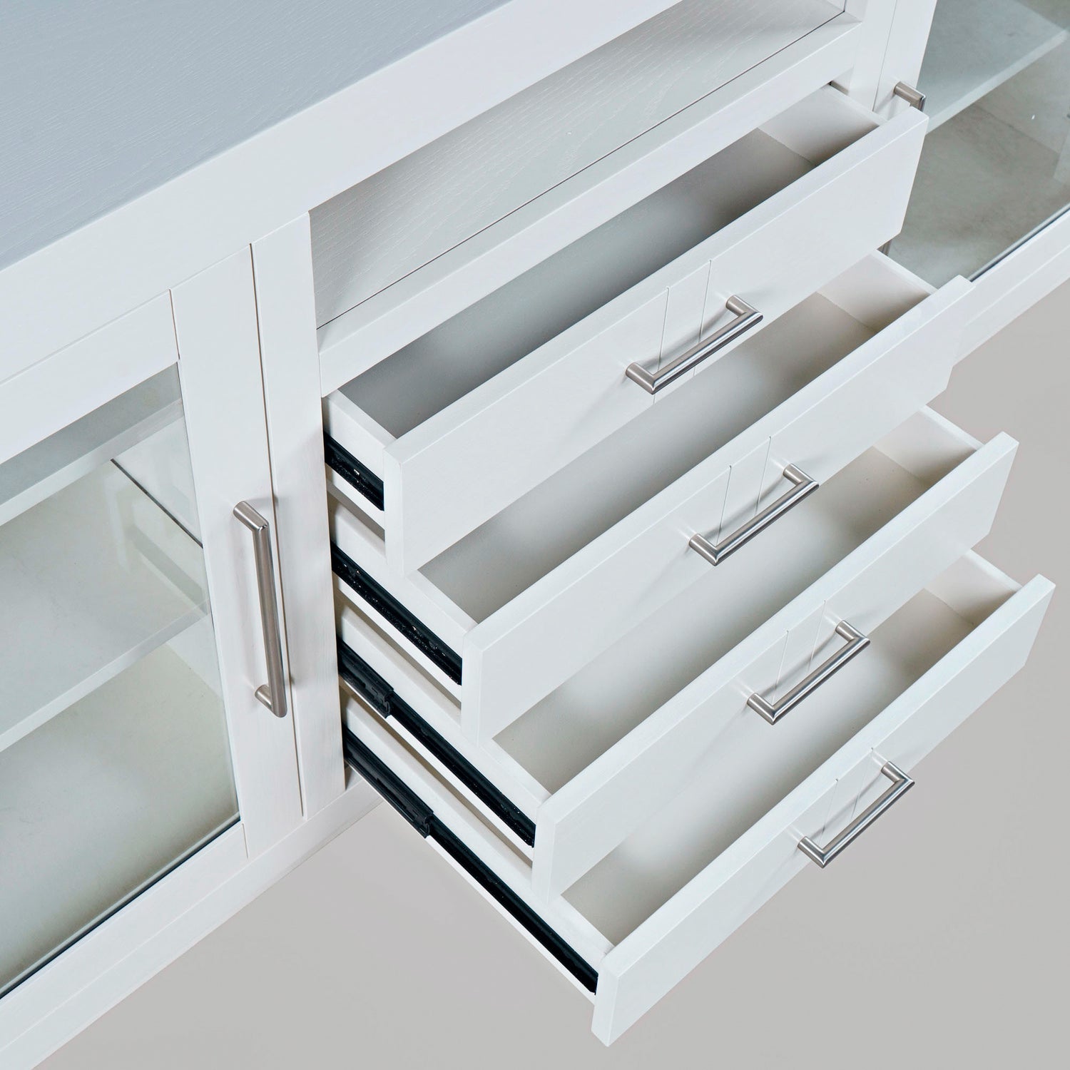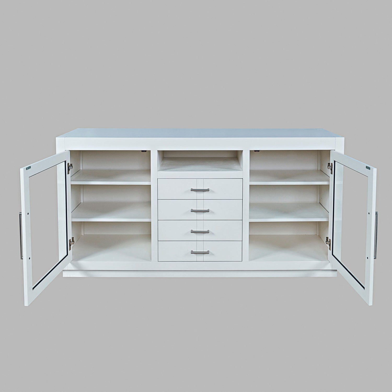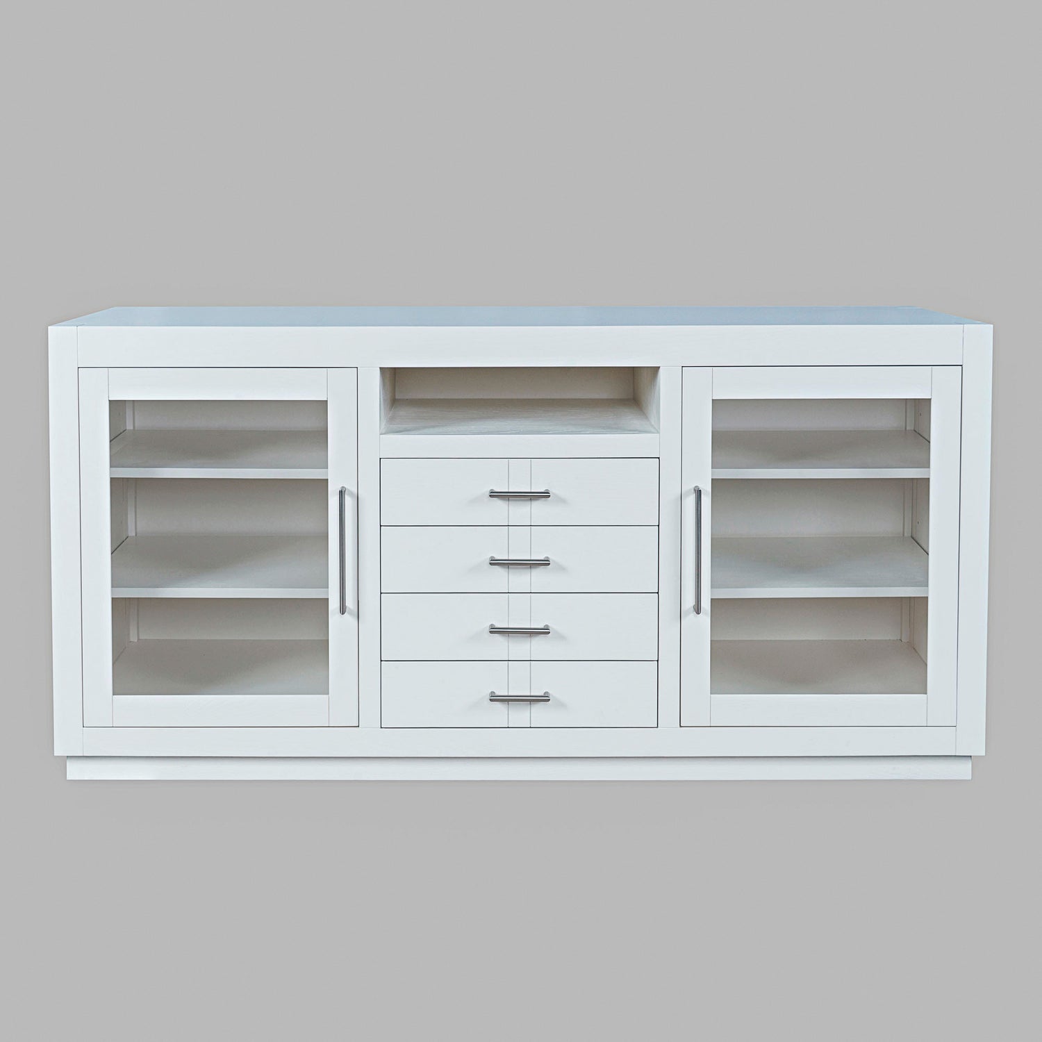 Contemporary design meets ample storage in the Auburn Hills 60 Inch Console. A bold frame and sleek bar hardware pair with tempered glass cabinet doors, perfect for storing items that you want tucked away, but still visible. Each cabinet has 2 adjustable shelves, so you can make sure it fits everything you need it to. And anything you want out of sight but still in reach can be put in one of the 4 center drawers. This modern TV stand is easy to assemble and at 60 inches wide, is great for any space.
