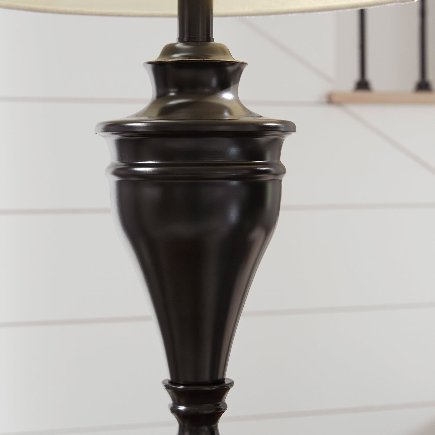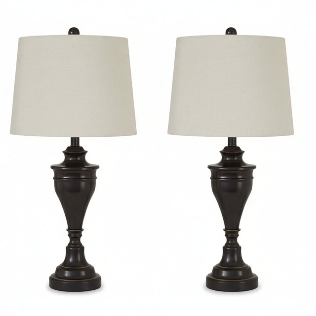 A delightfully turned pedestal base gives this table lamp set a sense of easy elegance. It's dark bronze-tone metal is a simply stylish counterpoint.