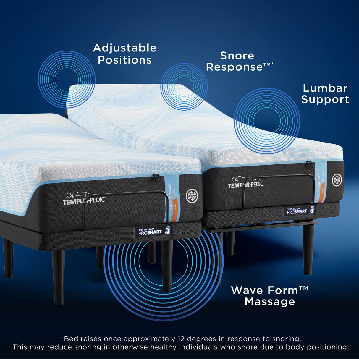 The new and improved TEMPUR-Ergo® ProSmart™ Base powered by Sleeptracker-AI® includes an innovative sleep solution that detects snoring and automatically changes your head position, so you aren't disturbed as you sleep. This may help reduce snoring caused by body position. This base includes innovative features that help you relax, such as soothing massage and the ability to connect Bluetooth devices that play soothing music, relaxing your body and mind and getting them ready for sleep. The app lets you receive personalized sleep coaching, insights and analytics that help improve your sleep quality. With almost unlimited head and foot lift positions, the TEMPUR-Ergo ProSmart Base allows you to take control of your comfort for reading, watching TV and, of course, sleeping.