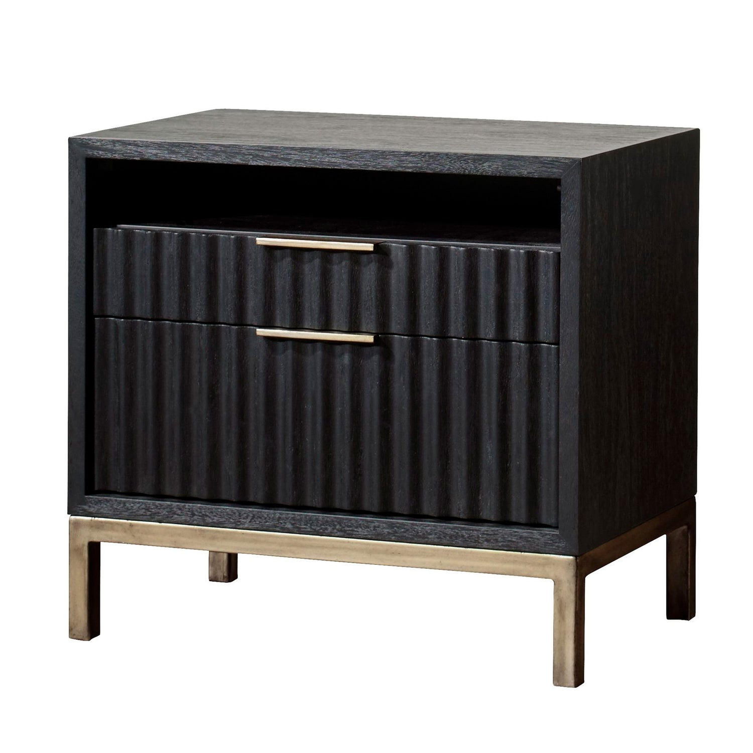 Inspired by the classic appeal of modern metropolitan design, the distinctive scalloped surface of our Kentfield collection is crafted from wire brushed solid Mahogany wood and stained in a Black Oak finish. Brushed brass top mount bar pulls and a tubular steel base provide the finishing touch.
