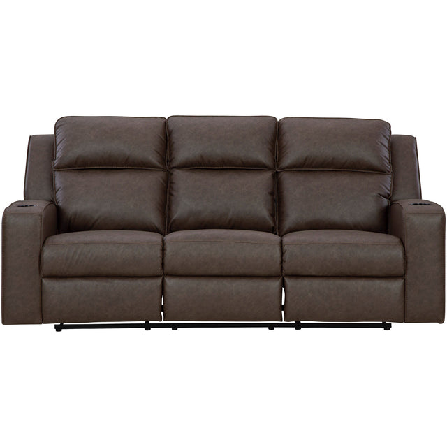 Indulge your desire for comfort and love for contemporary design with the Lavenhorne Reclining Drop Table Sofa. Designed with easy everyday living in mind, the sofa's heavyweight padded faux leather fabric upholstery makes it practical, while the contrast jumbo stitching accents give it a fashion-forward flair. The sleek track arms add a modern sensibility that elevates the look and feel of the design. The dropdown table with USB charging and dual cup holders keeps everything you need to relax within easy reach. The high-resiliency foam cushions wrapped in thick poly fiber bring exceptional comfort and supreme relaxation to your home.