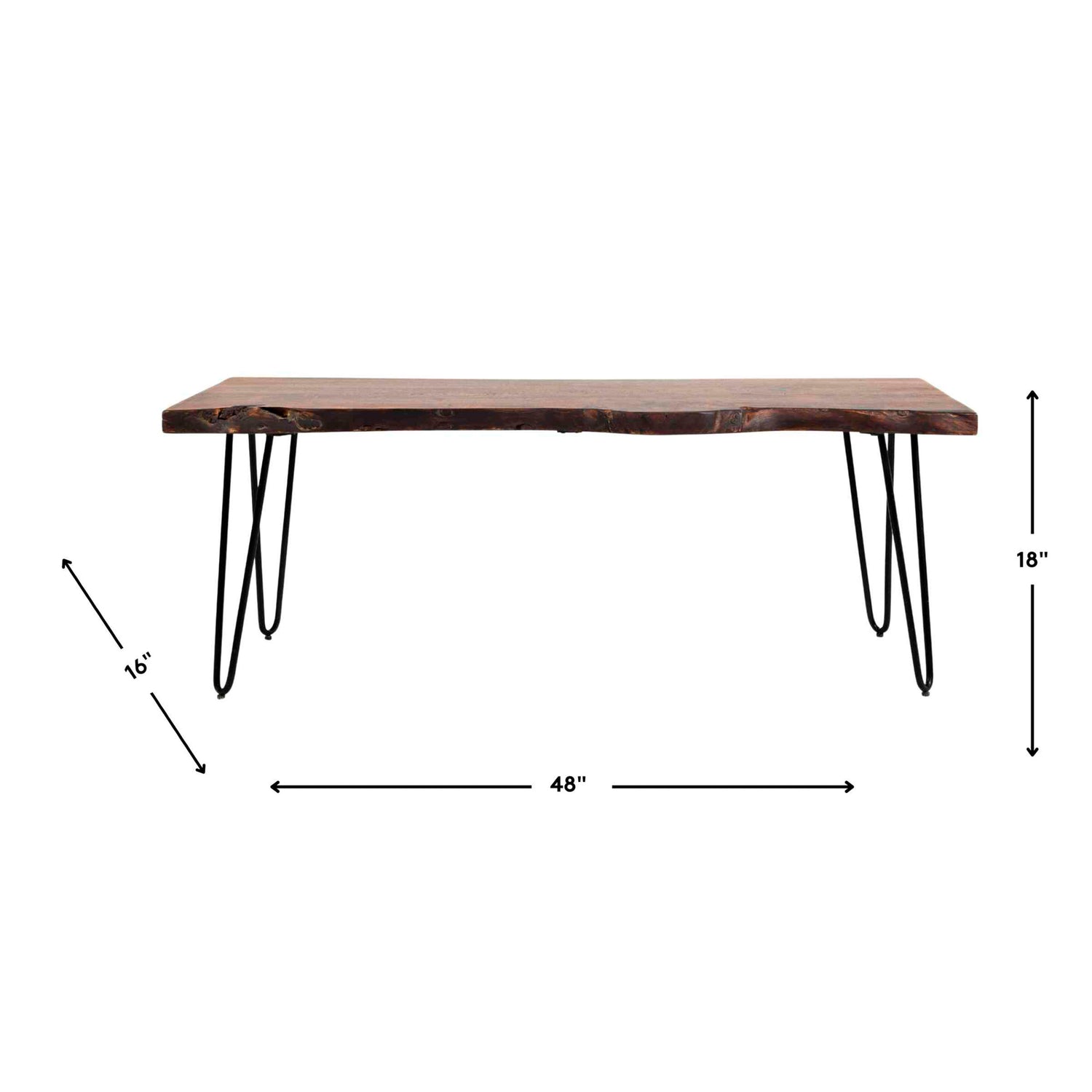 The Natures Edge 48 Inch Bench is not only stunning but perfectly one of a kind. It features breathtaking acacia wood preserved in its natural state. Hand-selected and crafted by artisans, this acacia hardwood bench with a natural edge creates a stunning look in any room. Because each piece of wood is unique, each bench is unique. The hairpin legs complement tie rich finish that highlights the wood grain. This bench will make a chic addition to any home decor style, including farmhouse, rustic, transitional, eclectic, boho, contemporary. Mix and match with chairs in the dining room, spice up the foyer or entryway, or add some flair to the foot of the bed, the ways you can use this bench in your decor are practically endless.