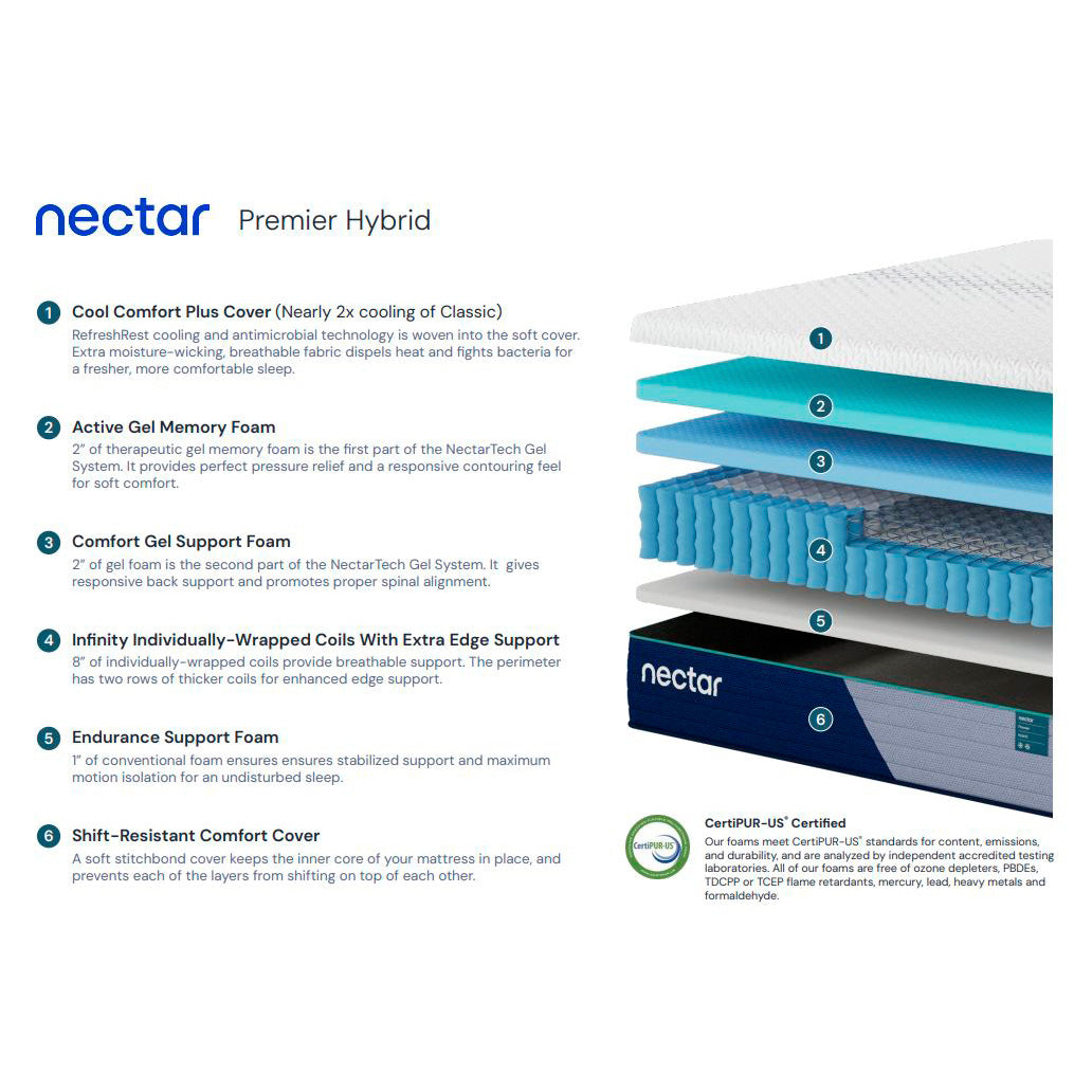 Upgrade your rest with the Nectar Premier Hybrid Mattress. It features enhanced cooling with a Cool Comfort Plus cover, two layers of gel-infused memory foam, and zoned coil support for full-body relief. If you want a plush feel without sacrificing structure, this mattress offers the best of both worlds.