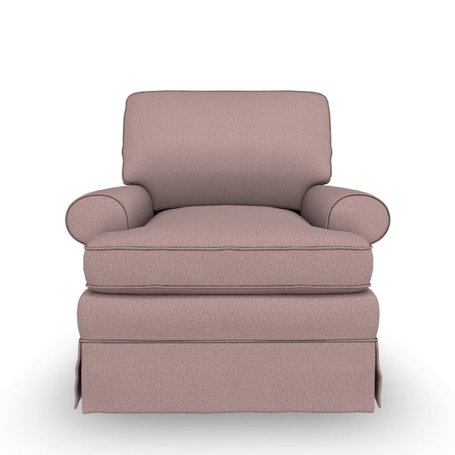 Quite possibly the most comfortable swivel glider imaginable. The pillow back is overstuffed with premium cushioning fibers and the lush seat cushion is wrapped with an air-lay fiber. Traditionally styled, this upholstered swivel glider features a banded and reversible seat cushion. The large, rolled arms are accented with cording. The look is finished off with a slightly taller skirt. A matching glide ottoman transitions the glide motion from your seat to your feet. - Product Details provided by Manufacturer, Slumberland not responsible for errors in information.