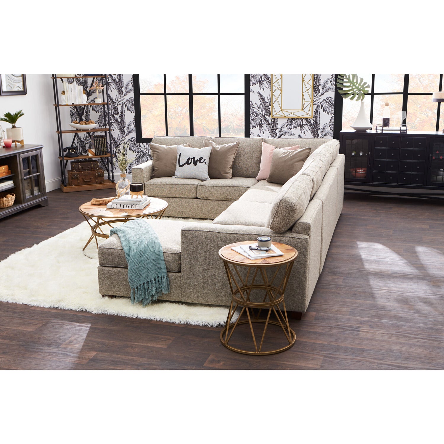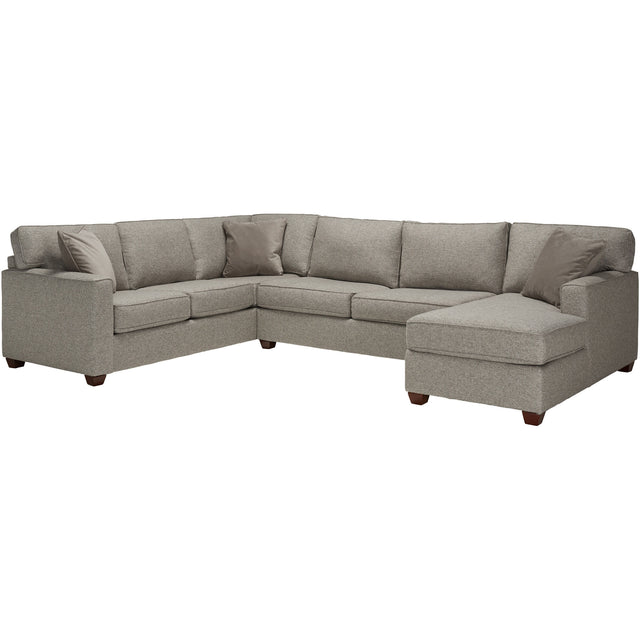 The Rise 3 piece sectional with right chaise brings just the right blend of simple, modern design and indulgent comfort. Offered in a chic shade of neutral gray, it comes with its own feather-filled accent pillows. This quality sectional has a hardwood and plywood frame that is corner blocked, stapled, and glued for durability. The back cushions feature channeled chambers filled with virgin polyester fiber, and foam core seat cushions are wrapped with Dacron polyester. Bring a whole new level of comfort to your living space with Rise.