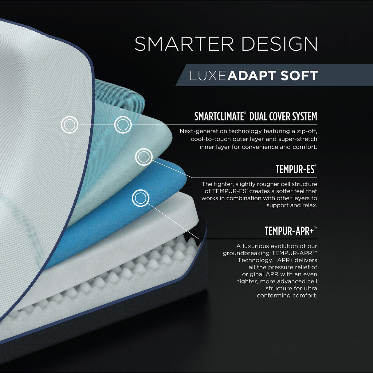 The TEMPUR-LuxeAdapt® Soft mattress is the ultimate TEMPUR® experience. Maximum pressure-relieving power. Superior motion cancellation. One-of-a-kind cooling technology. All combined with our groundbreaking material which intuitively adapts to your unique body in ultra-conforming comfort. Fall asleep faster. Stay asleep longer. And experience total relaxation from the moment you lie down to the moment you rise.